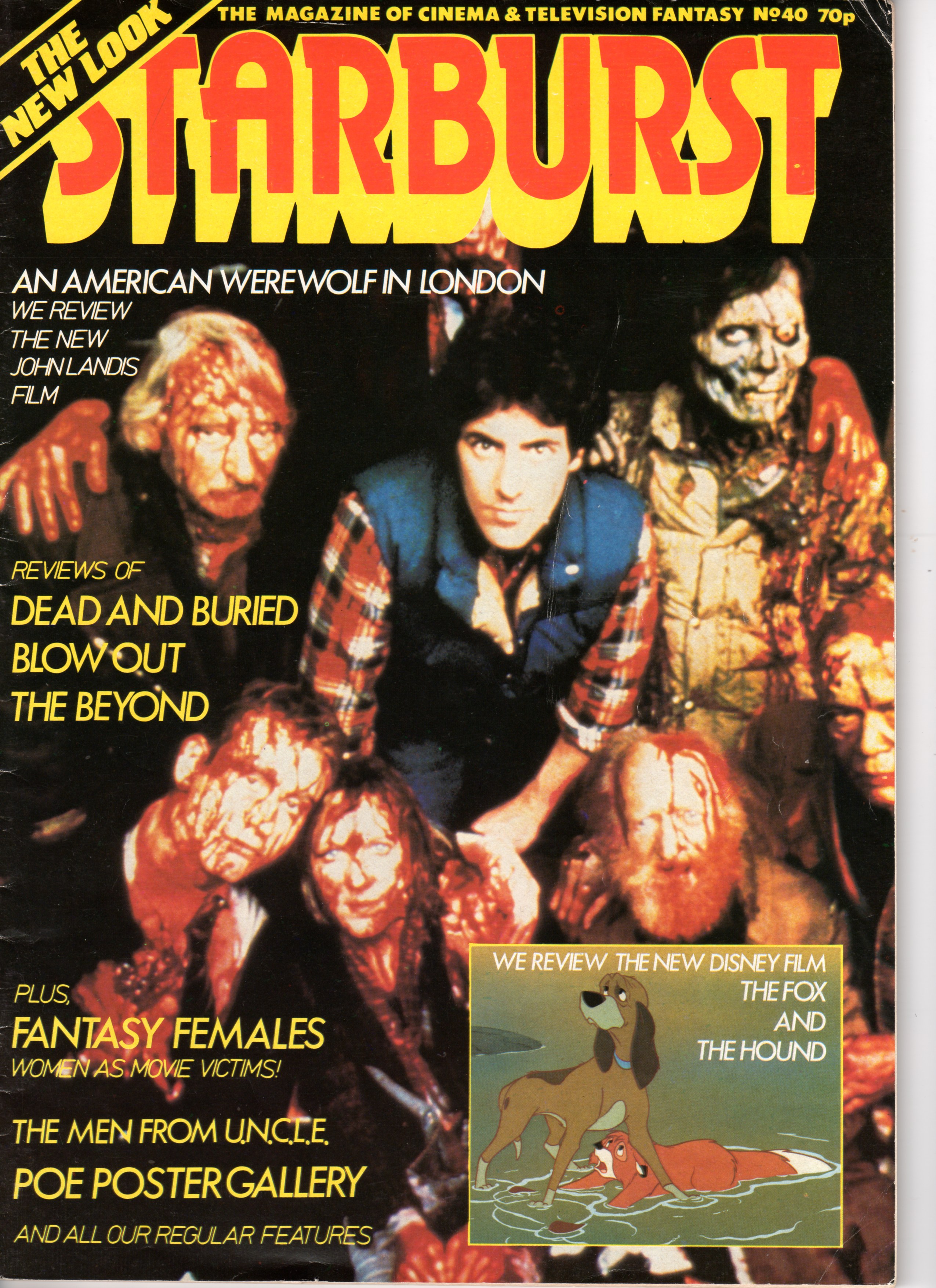 There was time when STARBURST was appealing to the FANGORIA market and the AMERICAN WEREWOLF IN LONDON issue (No. 40, Volume 4, Number 3, 1981) has a cover that is drenched in blood, featuring a publicity still, with the incongruent promise of Walt Disney’s FOX AND THE HOUND (1981). It was different times.