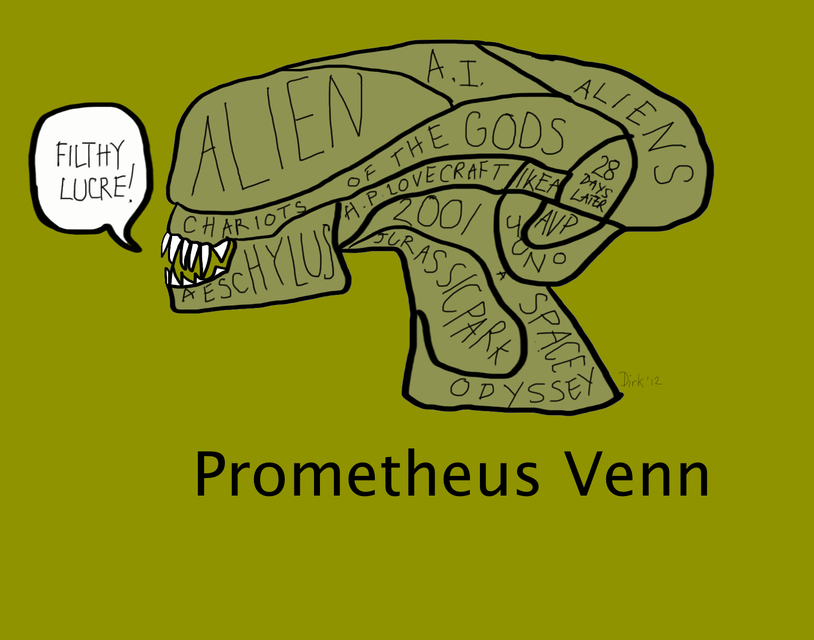 Thirty years on from pondering on the origins of the ship, PROMETHEUS returns to the space jockey and offers a sort of explanation that manages to ponderous and abrupt at the same time. I have produced a handy venn-diagram to help explain the influences and references to save you well-earned cash and a 3-heaD-ache: