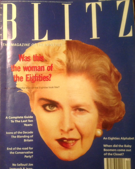 From deep within the Dirk vaults, I have found this issue of Blitz magazine dated December 1989. The magazine was reporting from the cutting edge of fashion, but now seems like a relic from another civilisation. On the cover, Thatch’s face melds into Madonna’s (True Blue, is this the face of women in the 80s?) It’s a photoshop mash-up that seemed innovative then, but now looks rather quaint. I have kept the magazine because it gives a review of the cultural trends of the decade.