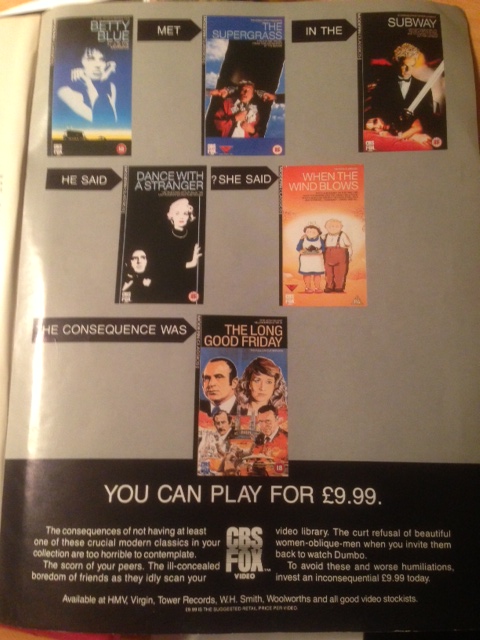 Betty Blue also features in one of the advertisement pages for VHS films saying that they are available from some of the retail giants representing the jewels in the crown of Thatcherism: HMV, Tower Records, Woolworths and Virgin. Stand up Margaret. Stand up.